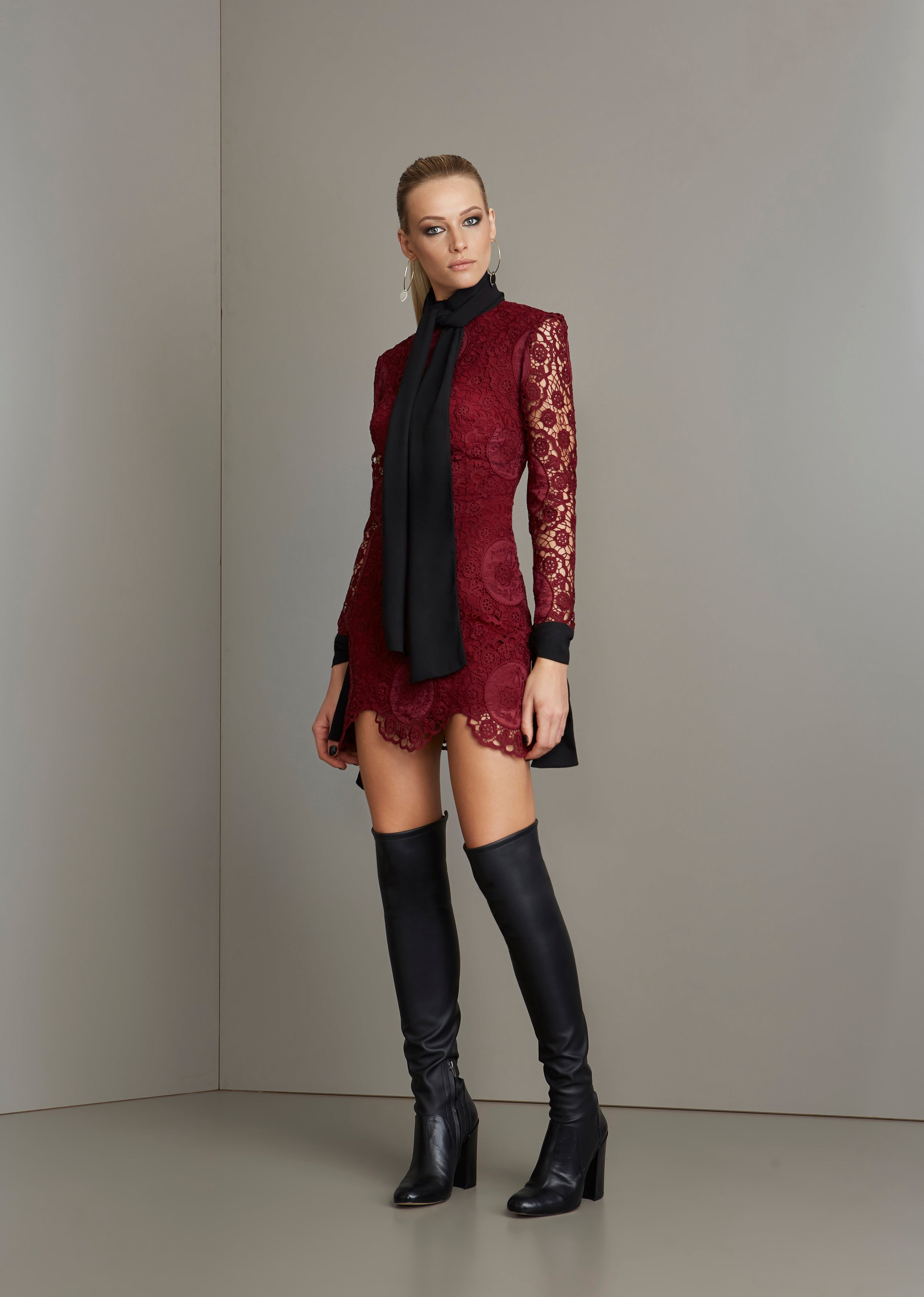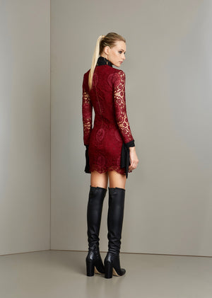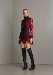 BURGUNDY ROUND LACE W/ BLACK BOW LS. DRESS